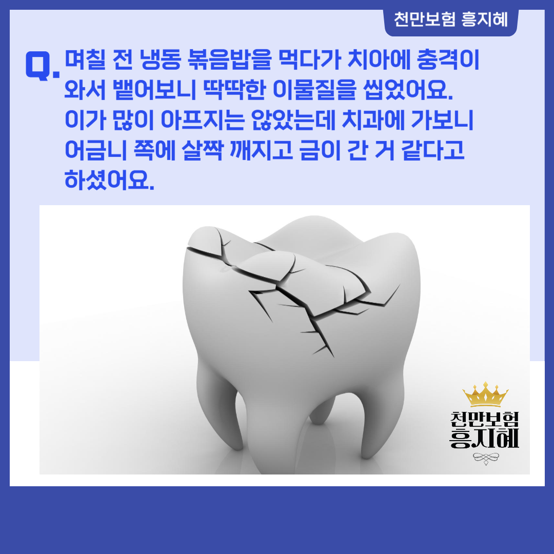 또한 치아보험이 있으신 경우에 이렇게 파절의 경우에는 면책기간이나 감액기간이라도 보장이 가능할 수 있으니 보험사에 문의해보시길 바라겠습니다.